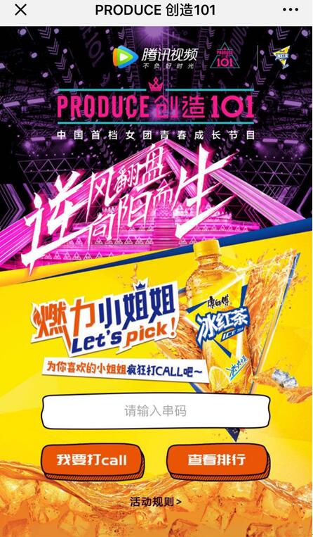 燃力爆棚的wuli山支大哥孟美岐、“宇宙少女”吴宣仪、萝莉身御姐音赖美云、“麻烦少女”杨超越…到底谁能成为“燃战队”的组合成员,与春春一起同台演出呢?主动权掌握在你们的手里!输入康师傅冰红茶瓶盖内串码为小姐姐打call,排名前三位的小姐姐将以“燃力担当”的身份组成燃战队,与wuli燃星人首领李宇春同台!