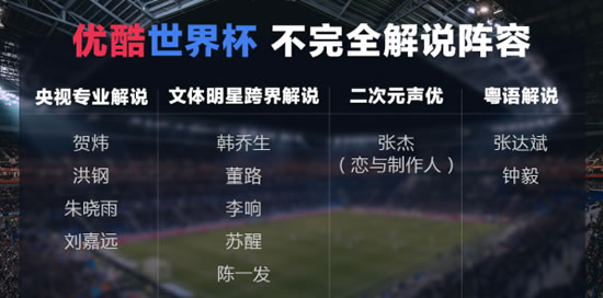 开创“意识流解说”先河的韩乔生、燃烧足球梦的全能主持董路、主持《超级女声》为人熟知的李响、实力派歌手苏醒、人气主播陈一发,这些文体明星的跨界解说,带来不少娱乐、时尚元素,让非球迷都忍不住期待起这届世界杯。此外,优酷还专门邀请张达斌、钟毅两位著名足球解说提供世界杯粤语解说,满足粤语圈的世界杯需求。