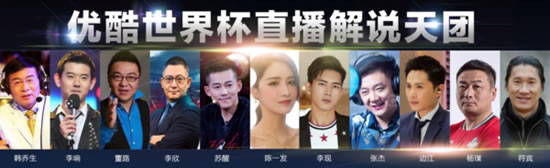 作为2018世界杯央视指定新媒体官方合作伙伴,拿下直播权的优酷同样发力解说团队配置,力求在满足“真球迷”专业需求的同时,兼顾“泛球迷”的娱乐需求。不仅有“五大名嘴+两大前国脚”的央视金牌解说员组合,优酷更组建了一支“央视专业解说+文体明星+二次元声优+粤语解说”的多元特色“解说天团”,在专业性的基础上显现出更多娱乐多元的互联网特色。
